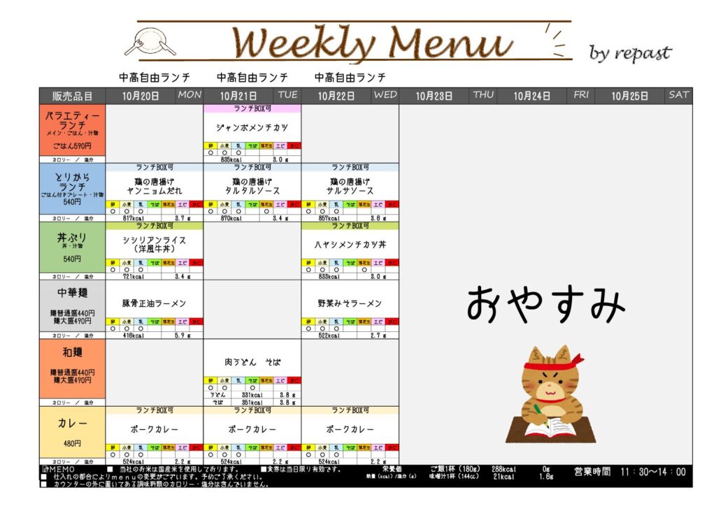 カフェテリアでの週替わりのランチメニューを紹介します。