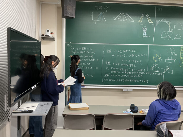 今回のゼミでは、三竹大寿先生による講義「掛谷予想―Wang-Zahl”定理”―」を受講しました。「長さ1の線分を(連続的に)1回転できるような面積最小の凸図形は何か?(掛谷問題)」のビジュアル的な理解から、それについての数式的な証明について学びました。