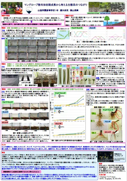 実験を進めていく中で、専門家の先生方から関連する論文をご紹介頂く等、ご指導していただきました。また、昨年末に開催された「日本マングローブ学会大会」に参加した際、モーリシャス沖での重油事故で現地調査された先生のお話を伺うことができました。重油で汚染されたマングローブは、そこに生息する鳥、魚だけでなく、食料とする現地の方々の生活も影響が出ていることを知り、生態系の大切さを改めて感じさせられました。