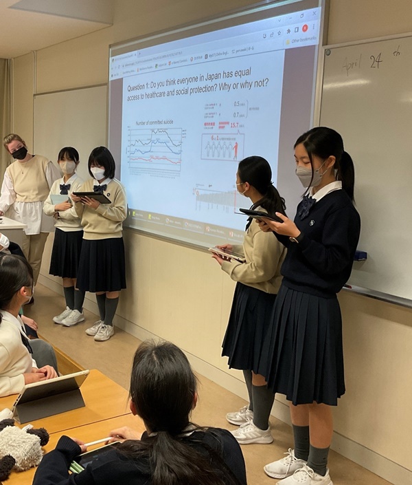 4月から7月の1学期の間では、SDGsで設定されているGoal3(健康),Goal4(教育),Goal5(ジェンダー)に関しての概要や、世界と日本の問題点などを英語で読みました。ECPで使用しているSDGs教材は、身近なケーススタディなどもあるため、生徒たちはSDGsの問題を自分事として考えることができるようになります。