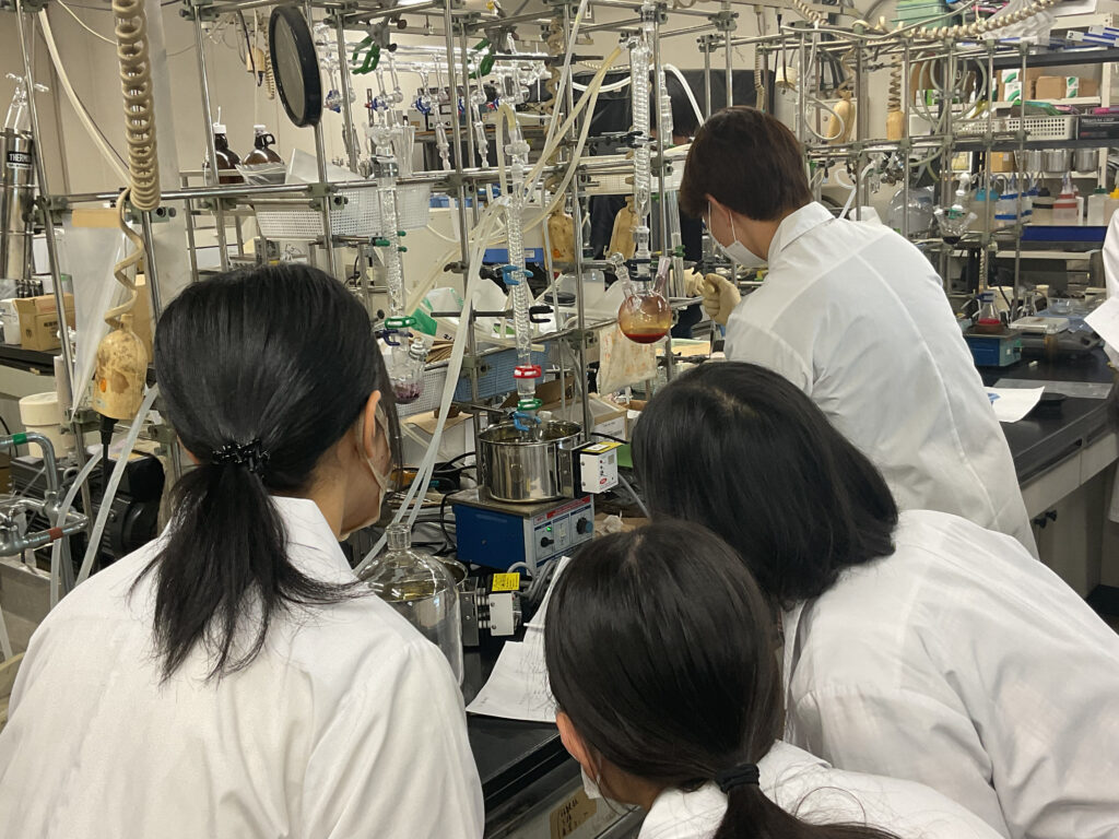 合成するにはかなり時間を要しましたが、実験の途中では担当する大学院生から研究の面白さや大変さを伺うことができました。実験後、荻野教授から高分子の基礎となる「有機化学」や高分子の研究の講義を拝聴しました。