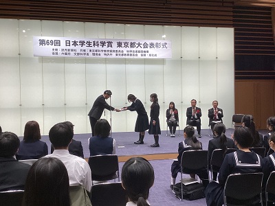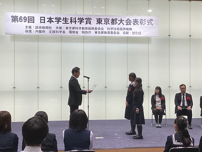 このたび、サイエンスコースで理数探究の活動に取り組んでいる物理研究室の高校2年生3名のチームが、「日本学生科学賞東京都大会」において努力賞を受賞し、11月1日に読売新聞社で行われた表彰式に出席しました。(1名都合がつかず2名での参加となりました。)