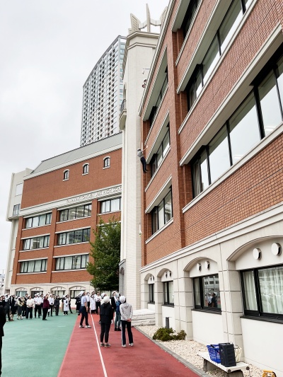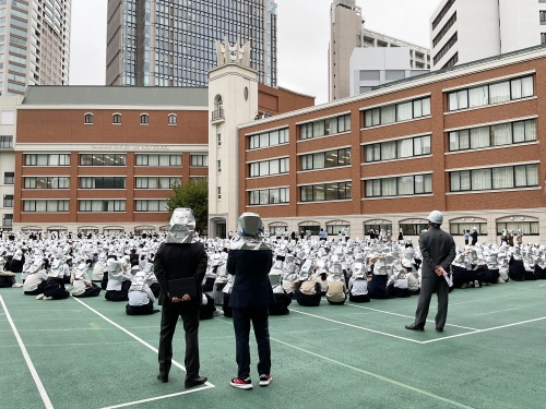 10月15日(水)6限目を利用し「令和7年度 第2回 防災訓練【地震発生時の避難】」を実施しました。今回の訓練は、全校生徒がタタメットを組み立て、防災ヘルメットとして被っての校庭への避難でした。避難開始の放送から9分32秒で全校生徒(約1600名)の点呼確認ができました。その後、2号館屋上から、「オリロー(避難用具)」使用のデモンストレーションが行われました。生徒たちが見守る中、3名の教員が屋上から避難しました。避難の実際を見て、生徒たちも緊急時の屋上からの避難を実感できたことでしょう。