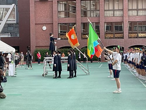 体育祭本番当日、委員で力をあわせて校庭を整備し、開会式をむかえました。