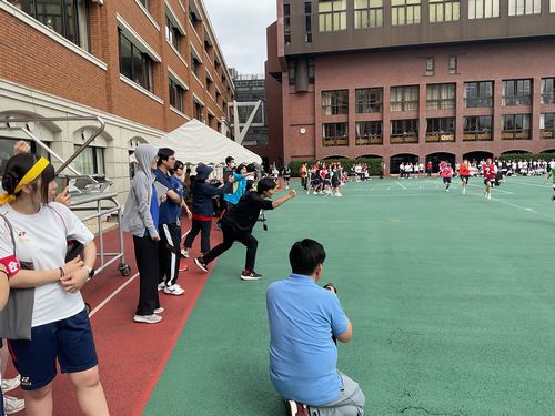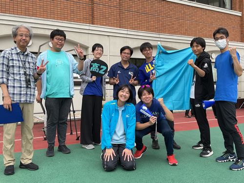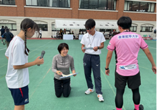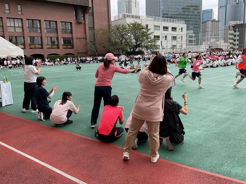 部活動対抗リレー本戦には、新任教員チームも出場!!学校長も身を乗り出して、応援。
