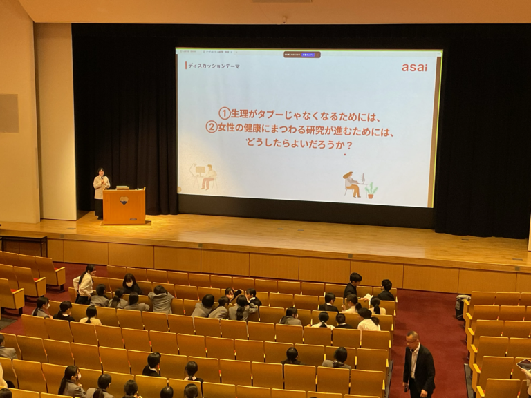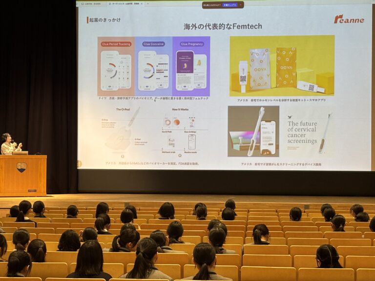 講義をしてくださったのは、株式会社asaiの代表取締役で、フェムテック起業家の浅井しなの先生です。「フェムテック」とは、female(女性)とTechnology(テクノロジー)をかけあわせた造語で、女性特有の健康課題をテクノロジーの力で解決するための製品・サービスのことです。