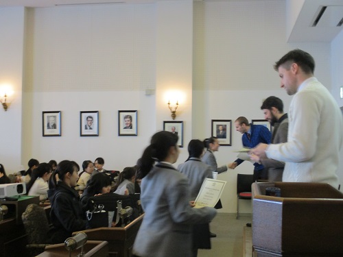 とうとう”Closing Ceremony”です。先生方が一人ひとりに声をかけながらCertificatesを手渡しして頂きました。最後に生徒代表スピーチにおいて、3日間の感謝の思いを先生方に英語で伝えました。